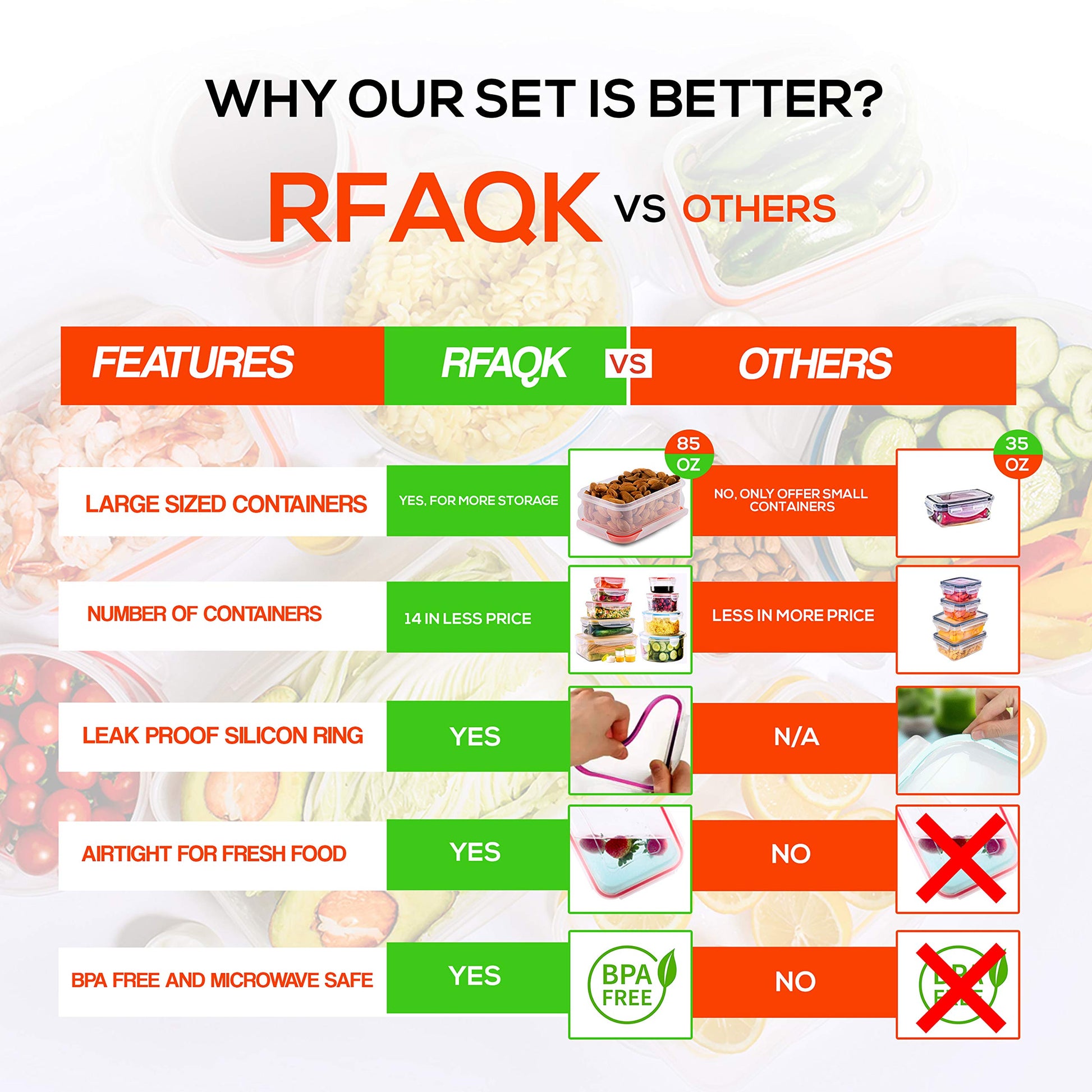 - 14 VERSATILE PLASTIC FOOD CONTAINERS WITH LIDS: An entire range of small to large-sized containers to store all types of food, snacks & leftovers. This set includes 5 rectangular containers (1*84.53oz, 1*50.72oz, 1*33.8oz, 1*16oz, 1*8.11oz) 4 round containers(1*77.77oz, 1*50.72oz, 1*27.05oz, 1*13.52oz) and 5 small sauce boxes (5*1.35oz).RFAQK containers are larger in size and are perfect for a variety of occasions gym,picnic,portion control, lunch,travel.The 1.35 oz size is ideal for small servings of sauces, condiments, or dips but not microwave-safe.