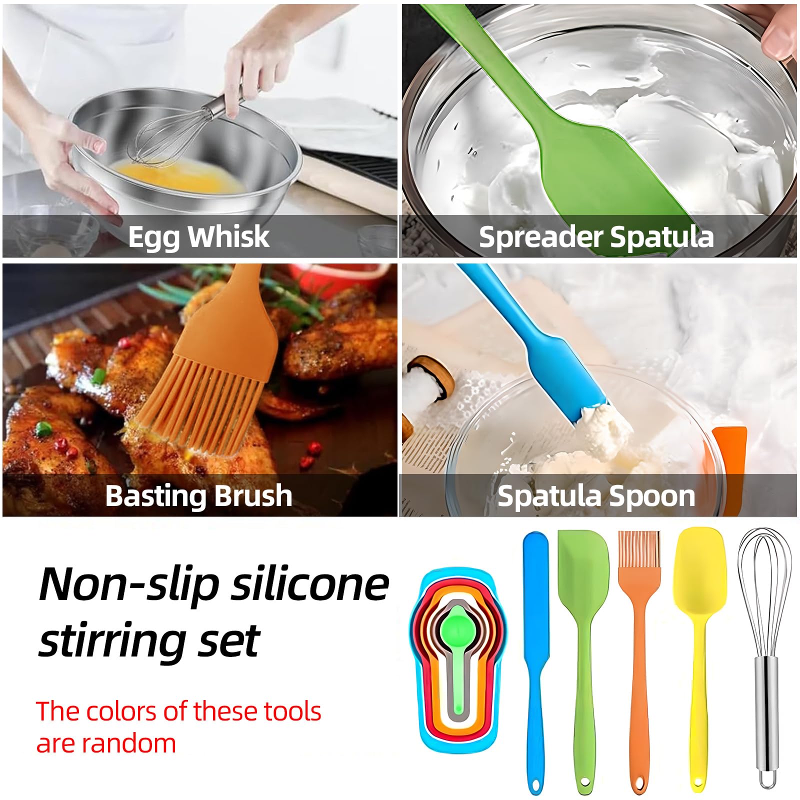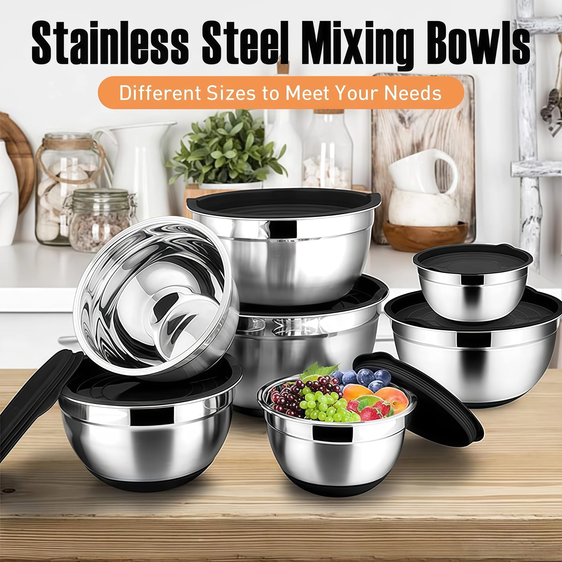 - Great Design: Our stainless steel mixing bowls with lids set use deepened design, don't worry about splashing while playing eggs and stirring, the inner curved bottom is smooth, and there is no dead angle to clean them. Non-slip external silicone bottom, keep the nesting bowls on the desk steady while mixing.