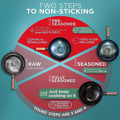 - TRUE FLAVOR & VERSATILITY: The YOSUKATA 34 cm carbon steel wok with a flat bottom is specially designed to retain juices and enhance taste. Whether you're looking for a grill wok, BBQ wok, extra large wok, fried rice pan, or a professional authentic wok for home, outdoor, or restaurant use, it’s ideal for stir-frying, pan-frying, braising, deep-frying, searing, steaming, and even smoking. Discover the rich, true flavours of Chinese and Asian cuisine.