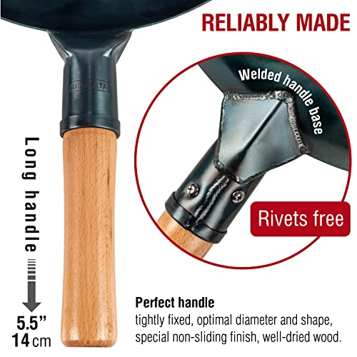 - DURABLE MATERIALS & ERGONOMIC DESIGN: Forged from 15-gauge heavy-duty carbon steel, this deep wok pan is heat-resistant and built to last. The ergonomic non-sliding wooden handle provides a safe, comfortable grip during long cooking sessions—perfect for both stir-frying and deep-frying. NOTE: A 1.85 kg, it’s heavy – just like a true traditional authentic wok built for professional use.